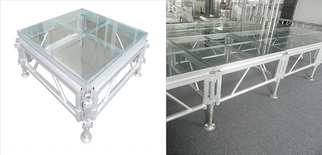 - La structure de la scène est soutenue par un cadre en aluminium durable.